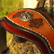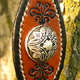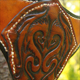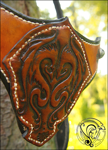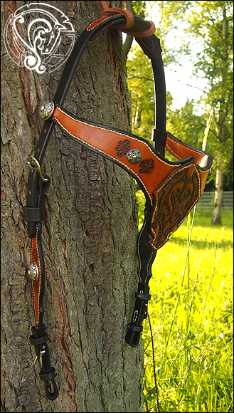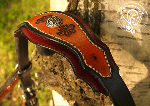 Der Stirnriemen zeigt ein punziertes Drachenemblem und wird von eleganten Mustern und den Beschlägen