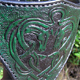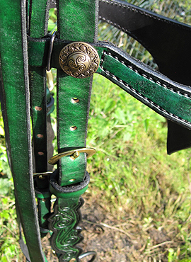 Ein smaragdgrüner Westernzaum mit keltischen Elementen und Punzierungen sowie Messingbeschlägen.
