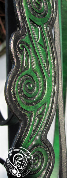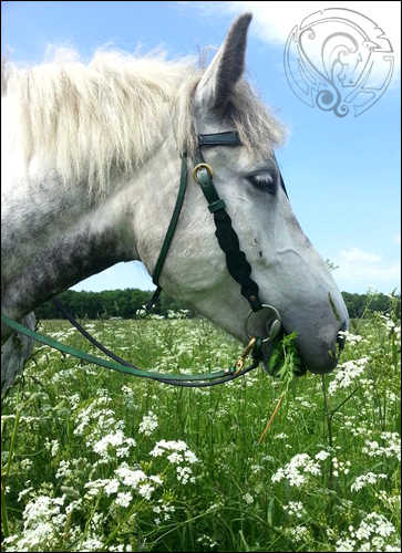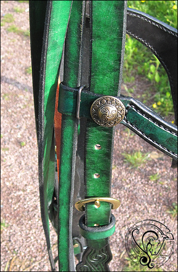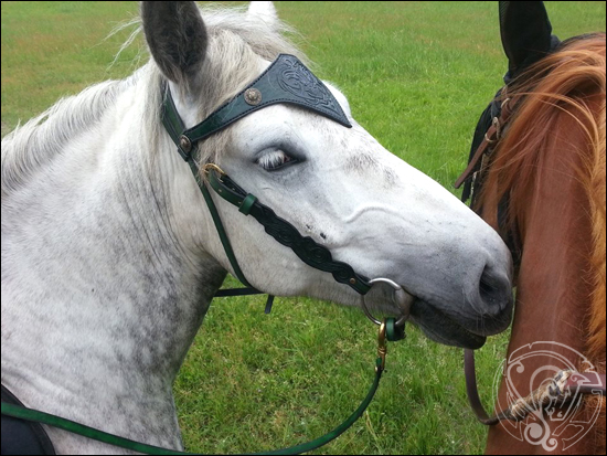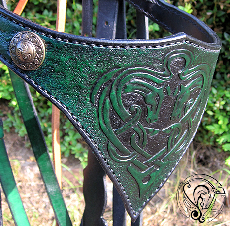 Der Stirnriemen zeigt einen keltischen Knoten mit Pferdeköpfen, auf den Backenstücken wurde ein Kundenentwurf