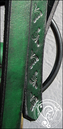 Die dazu gehörenden, geteilten Zügel sind in antikem Grün gehalten und an den Enden punziert.