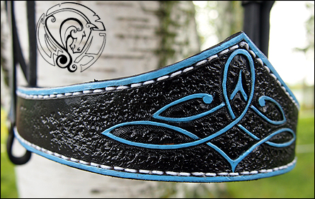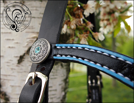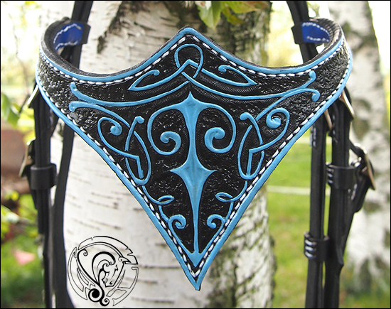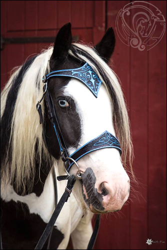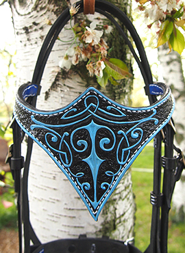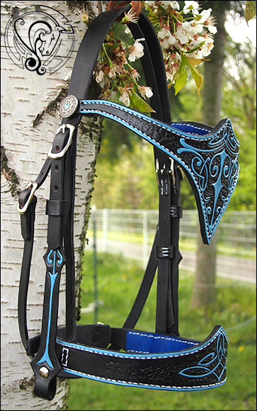Hier wurden nach Kundenentwurf diverse Ornamente auf Stirn- und Nasenriemen sowie den Backenstücken punziert