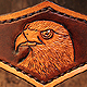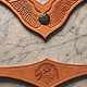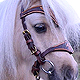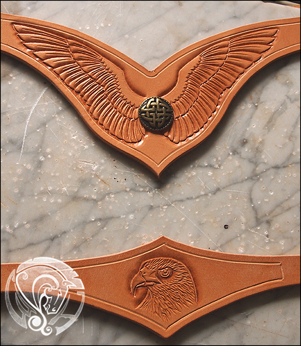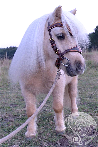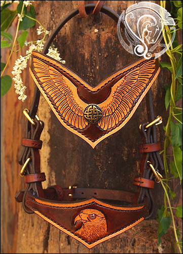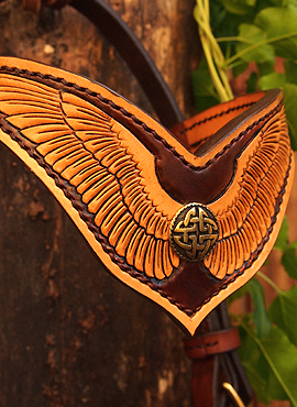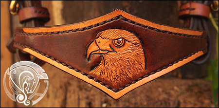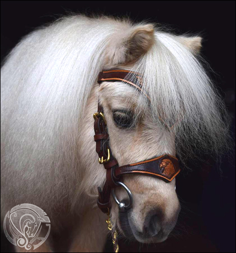 "Mini!": Ein wirklich winziges Spanisch-Zäumchen zum Thema Falken. Aufgrund der Größe - oder vielmehr Winzigkeit - des kleinen Picassos war dieser Zaum eine besondere Herausforderung. Entstanden ist ein robuster, kleiner Zaum in dunkelbraun und natur, der auf dem Stirnriemen Falkenschwingen und einen kleinen keltischen Beschlag zeigt. Ein Falkenportrait ziert hingegen den Nasenriemen, die Nähte sind unauffällig in einem dazu passenden Braunton gehalten. Wer den kleinen Prachtkerl (und den Zaum) einmal in natura sehen möchte, der sollte die Veranstaltungen auf seiner Seite im Auge behalten: Fleetwood Ley Picasso