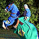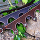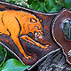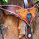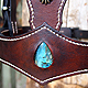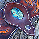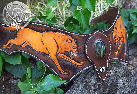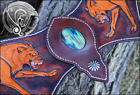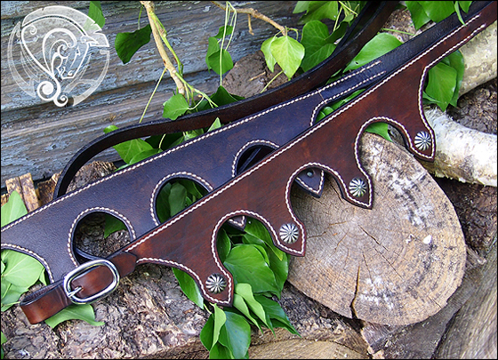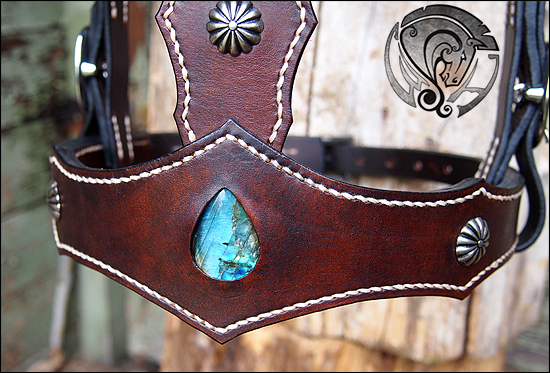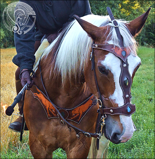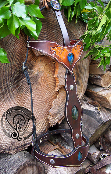 Für den Pintowallach Boreas: Ein Edelstein-Set zum Thema Wölfe, bestehend aus einem Barockzaum, Zügeln und einem Ziervorderzeug. Es durfte diesmal etwas "wilder" werden, so zeigt der Stirnriemen des Zaums zähnefletschende Wolfsportraits in hellem Braun auf dunkelbraunem Grund. Mittelalterliche Rosetten und drei eingesetzte Labradorite zieren Stirn-, Mittel- und Nasenriemen, die allesamt mit einer hellen Kontrastnaht umnäht wurden. Der Mittelriemen ist verstellbar, sodass bei einer Höhenverstellung des Nasenriemens nichts abstehen kann und der Zaum immer gut sitzt. Die Zügeleinsätze haben eine mittelalterlich inspirierte Form und sind ebenso beschlagen. Das Vorderzeug schließlich fällt nicht nur durch seine markante Form auf, sondern auch durch den großen Labradoriten im Bruststück und die punzierten, angreifenden Wölfe auf den Schulterriemen. Boreas und seine Reiterin sind Teil der Badischen Ritterschaft und können auf diversen Shows und Veranstaltungen hautnah und in Aktion erlebt werden.