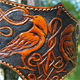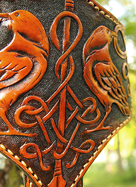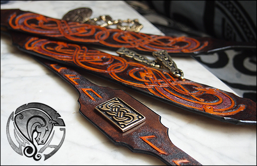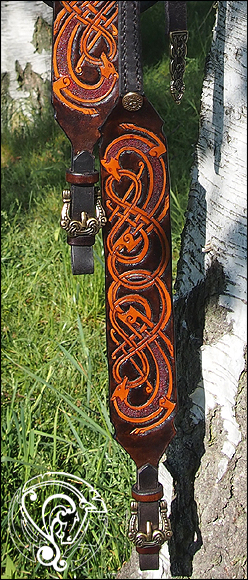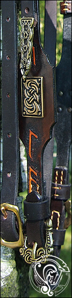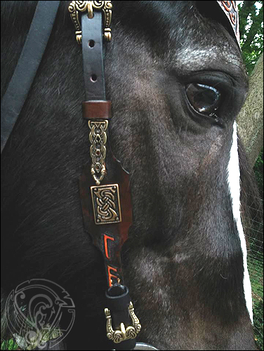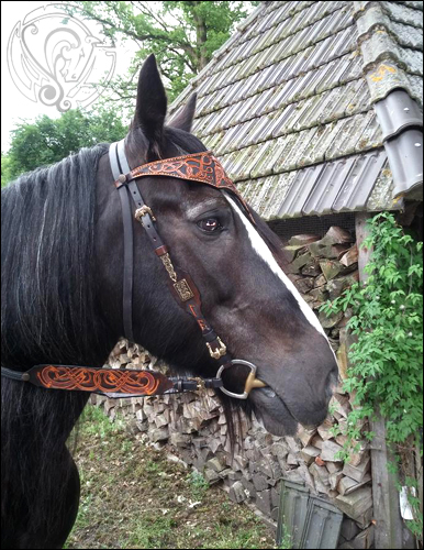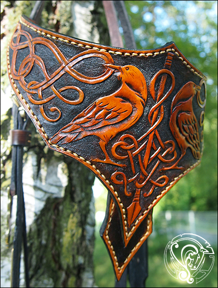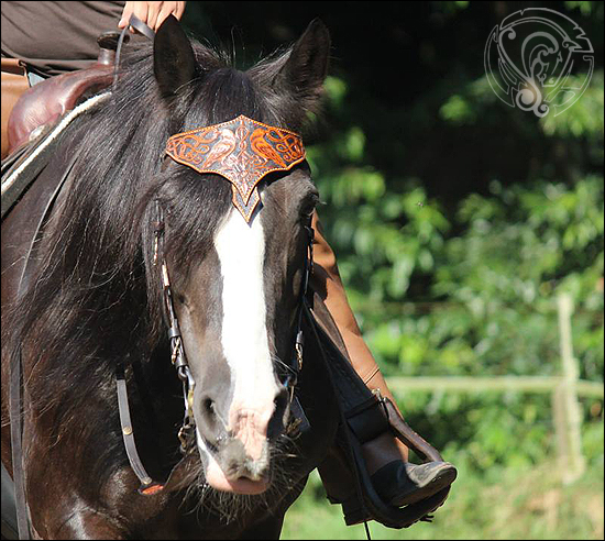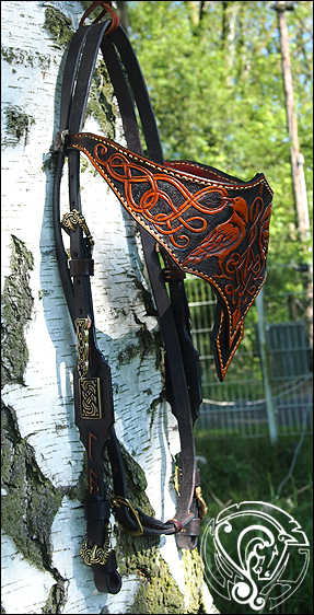Der stattliche Stirnriemen ist detailreich mit nordischen Knoten, den Raben Hugin und Munin