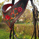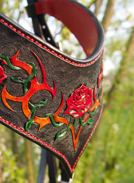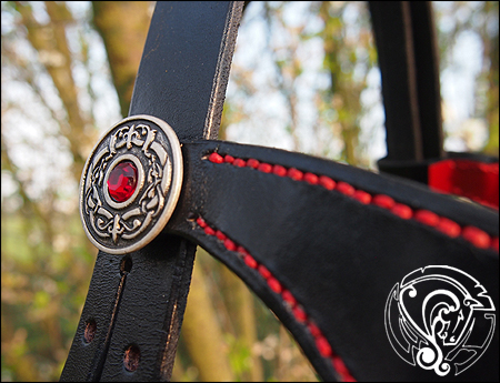 Ein außergewöhnlicher Englischzaum in schwarz und rot mit auffallenden Punzierungen.