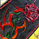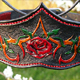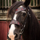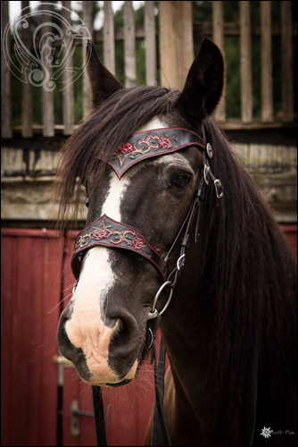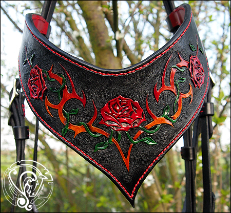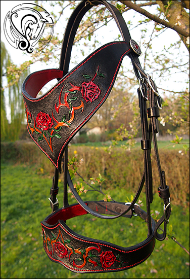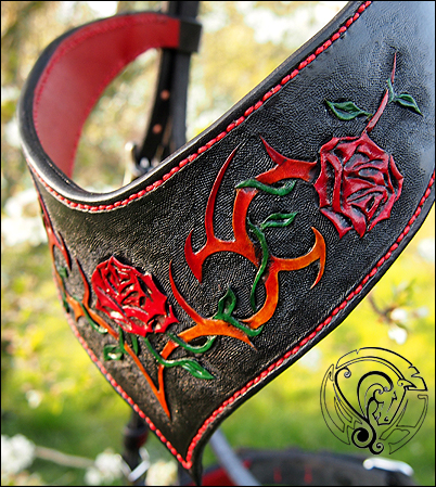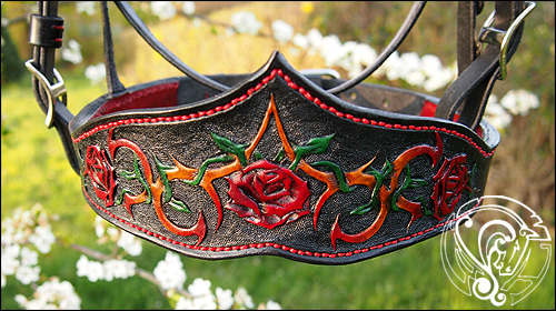 Auf Stirn- und Nasenriemen befinden sich Rosenranken und Tribals mit fließendem Farbverlauf, der Beschlag