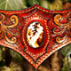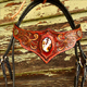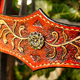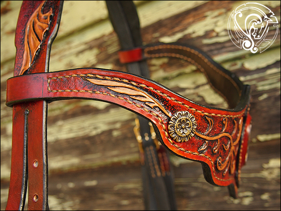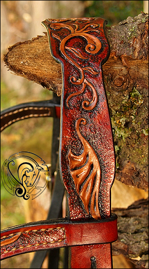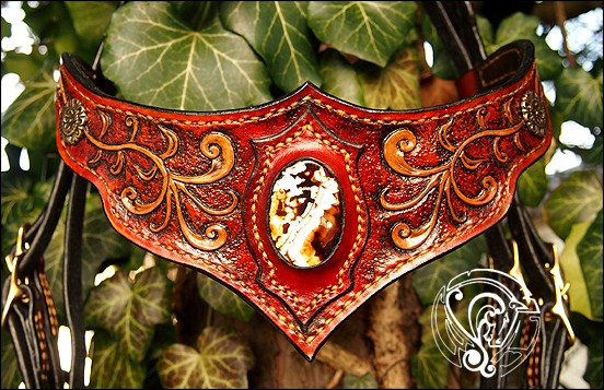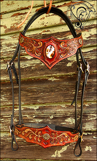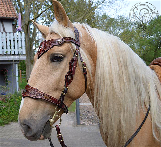 Kleine, messingfarbene Blumenbeschläge und ein Schokoladenachat auf dem Stirnriemen ergänzen den auffälligen
