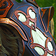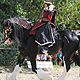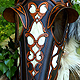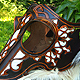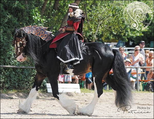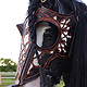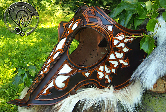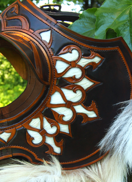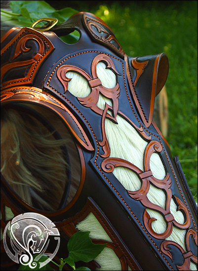 Für den Shire Horse - Hengst Stonefield Sir Ivanhoe: Eine große Roßstirn mit Augenschilden und einem kleinen Schnabel in schokobraun und walnuss zum Thema Mittelalter. Die Punzierungen wurden hier an die damalige florale Ornamentik angelehnt und die Zwischenräume zudem auch ausgeschnitten (Filigrantechnik). Für ein ganz besonderes Erscheinungsbild wurde das ganze mit einem weißen Ziegenfell unterlegt. Wir hatten und haben hier das besondere Vergnügen, mit dem Dudelhof zusammen zu arbeiten. Ivanhoe gehört zu den dortigen Hengsten und kann auf den unterschiedlichsten Veranstaltungen bewundert werden - mittlerweile nicht nur mit Roßstirn, sondern auch dem dazu gehörigen Kanz.