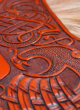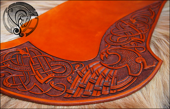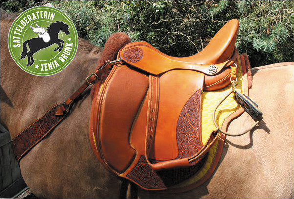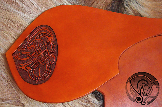 Für den Isländerwallach Helfari: Hier ist zum Thema Wikinger / Adler ein Set in kräftigem light tan entstanden, das auch diesen besonderen Sattel beinhaltet. Angelehnt an die Tierstile der Wikingerzeit haben wir ein sehr aufwendiges und detailreiches Motiv entworfen, das nun in Form einer Punzierung die Ränder der großen Sattelblätter ziert. Die kleinen Sattelblätter wurden ebenso mit einem kleinen Knoten sowie einem Beschlag verziert.