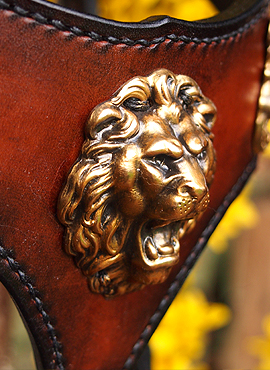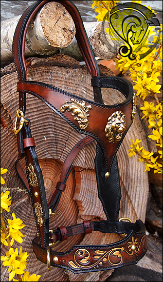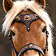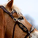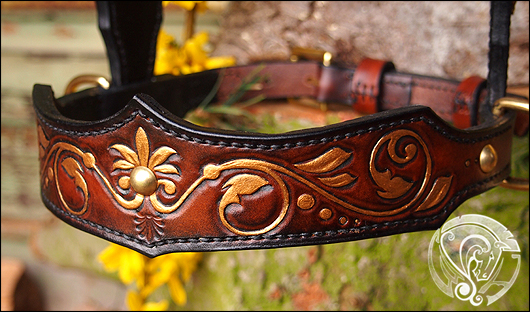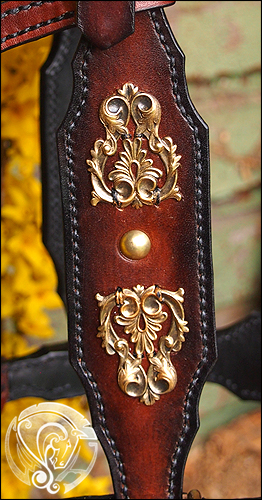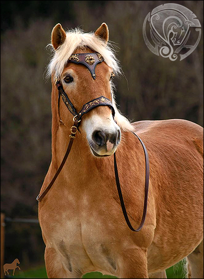 Für den Haflinger Alessio: Ein prunkvoller, dunkelbrauner Zaum, nachdem auch Aramis von Hors-e-motion bereits sein Set von uns erhalten hat. Für Alessio ist es nun allerdings deutlich barocker geworden: Der antikbraune Zaum wurde mit eleganten Messingbeschlägen am Stirnriemen und den Backenstücken versehen, der Nasenriemen zeigt dazu passend eine florale, goldfarbene Punzierung. Bei all der Gestaltung ist die Zweckmäßigkeit natürlich wie immer nicht zu kurz gekommen: Der Genickriemen ist weich gepolstert und mit Ohrausschnitten versehen, und ein Ganaschenriemen sorgt für einen optimalen Sitz des gebissloses Zaumes.