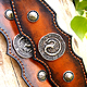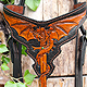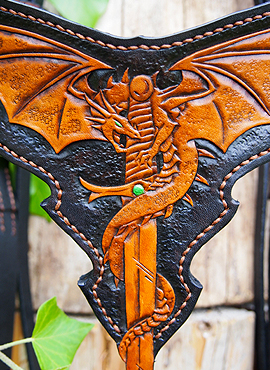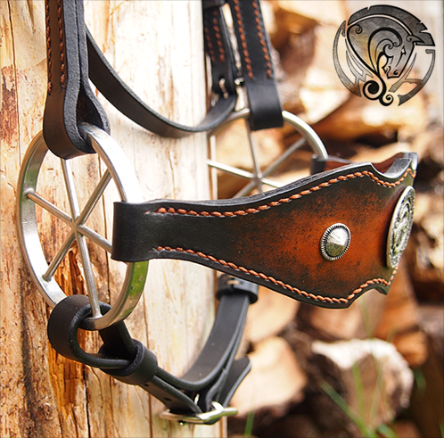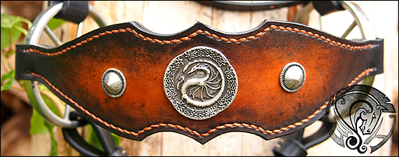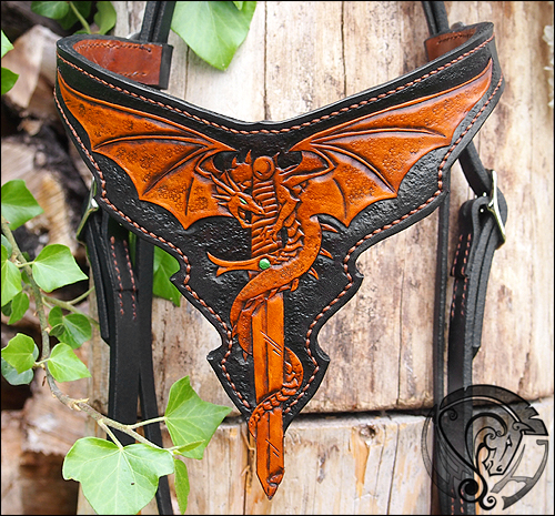 Ein schwarzer Glücksrad-Zaum zum Thema Drachen/ Schwert.
