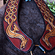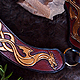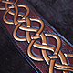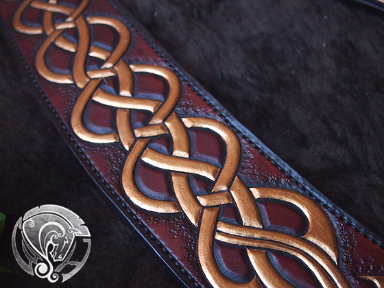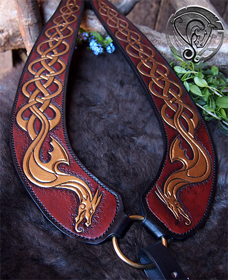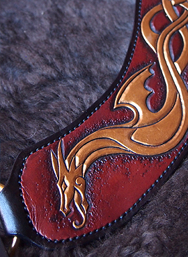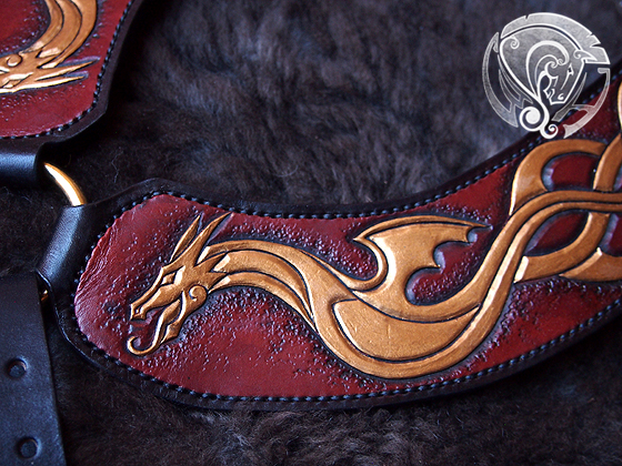 Rohan": Ein Vorderzeug zum Thema Herr der Ringe / Smaug. Dieses Vorderzeug wurde passend zu der gleichnamigen Roßstirn und dem Zaum- und Zügelset gefertigt und ist wie diese in den Farben schwarz, mahagoni und gold gehalten. Wie auch bei den anderen Teilen des Sets haben wir auf jedem Schulterriemen einen stilisierten, golden gefärbten Drachen punziert, dessen Körper in ein formatfüllendes Knotenmuster übergeht. Eine schwarze Naht trennt den mahagonifarbenen Hintergrund von der schwarzen Grundfarbe des Vorderzeugs.