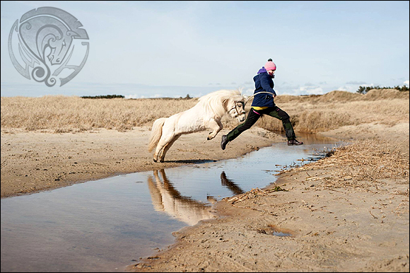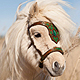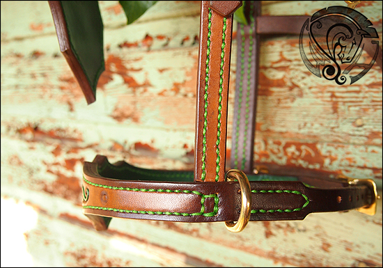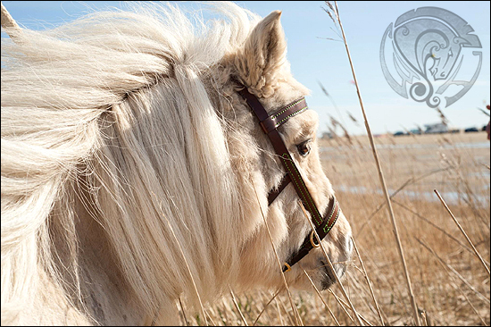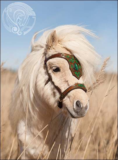 "Mini!": Ein gebissloser Edelstein-Zaum zum Thema Efeu / Schlachtross in den Farben walnuss und grün. Gewünscht war hier, möglichst viel Leder ähnlich einer Ross-Stirn ans Pony zu bringen, dementsprechend wuchtig ist das "Zäumchen" ausgefallen. Der Stirnriemen wurde schildartig vergrößert, die Backenstücke sind dubliert und anstatt eines Kehlriemens wurde ein Ganaschenriemen eingenäht. Auf dem Stirn- und Nasenriemen wurde der Efeu in Form von Punzierungen umgesetzt und mit metallischen Reflexen versehen. Das Grün des Efeus findet sich sowohl in den Handnähten als auch in dem eingesetzten Malachit des Stirnriemens wieder. Der Zaum ging gleich mit nach Dänemark auf Reisen, wo dank Ralph Kuhns viele wunderbare Bilder entstanden sind.