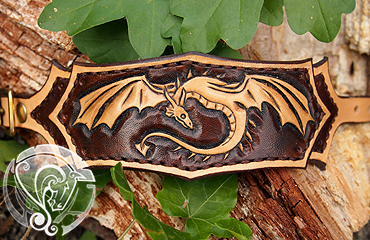 Das Armband ist in den Farben natur und dunkelbraun gehalten und mit einem kleinen Drachen punziert.