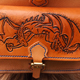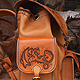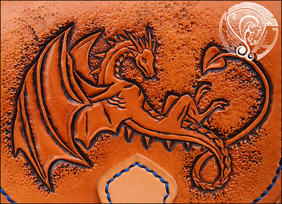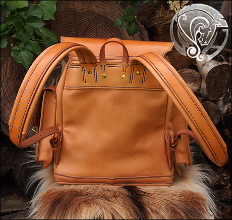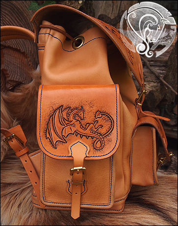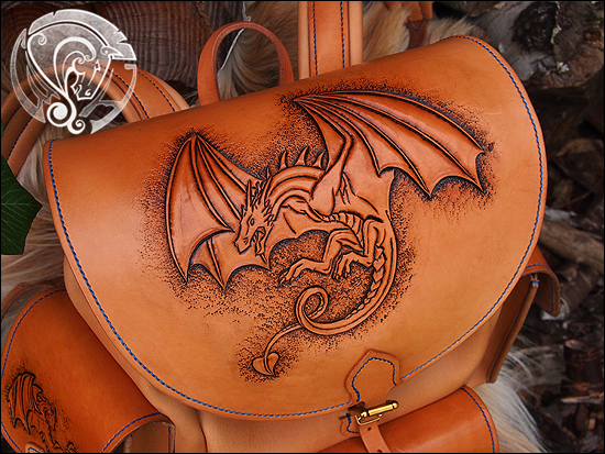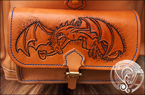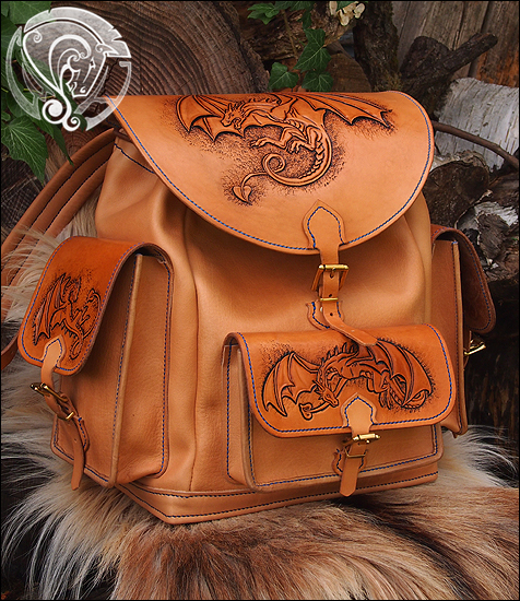 von denen kann frau schließlich nie genug haben. Der robuste Rucksack wurde aus naturfarbenem Leder gefertigt und besitzt einen extra starken Boden, ein mit Neopren gepolstertes Rückenteil und ebenso mit Neopren gepolsterte Schulterriemen. Neben den drei Außentaschen haben wir ihn auf Wunsch noch mit einem großen und drei kleineren Innenfächern versehen; alle außen liegenden Taschen sind mit Messingschnallen zu verschließen. Drachen haben wir unübersehbar auf jeder Klappe der Außenfächer punziert, sie sind zusammen mit den blauen Nähten der ganze Schmuck dieses Rucksacks. Mehr über Perdita und ihre Arbeit könnt Ihr mitunter hier erfahren: Hundeakademie Rettet das Nashorn
