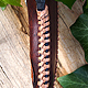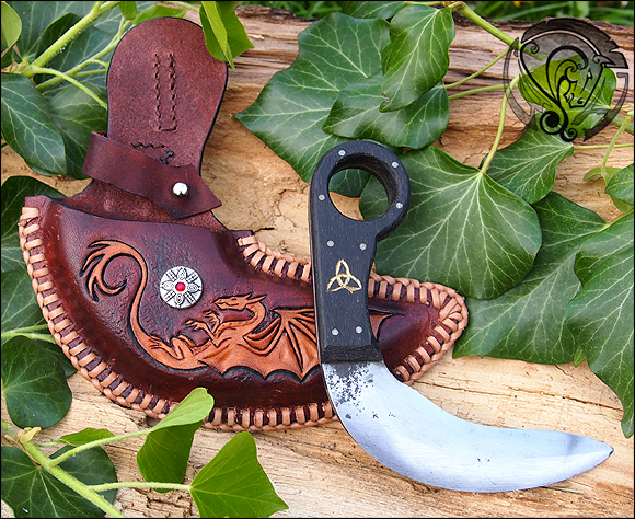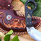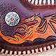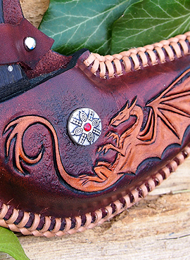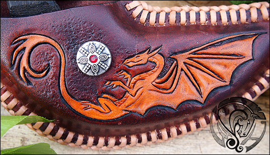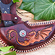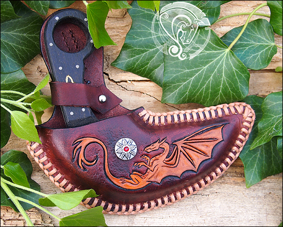 Die Lederhülle in kräftigem mahagoni und tan wurde mit einem kleinen Drachen