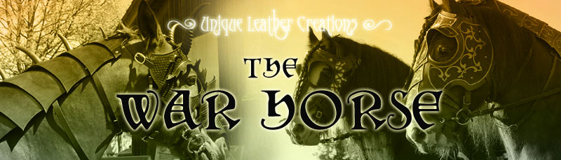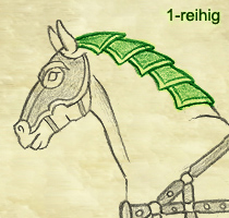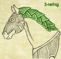 | .o Kanz (Crinet) Der Kanz bedeckt den Hals Eures Rosses vom Genick bis zum Ansatz des Widerrißtes, kann auf Wunsch allerdings auch kürzer ausfallen (z. B. nur den halben Hals bedeckend, so hätten wir einen halben Kanz). Er ist in alle Richtungen beweglich, sodass er Euer Ross in der Bewegung nicht einschränkt. Die Anzahl und Breite der einzelnen Schuppen ist abhängig von der Halslänge des Pferdes als auch der gewünschten Gestaltung. Der Kanz ist nicht dafür geeignet, um nur mit einem Zaumzeug verwendet zu werden, sondern wird stets mit einer Roßstirn (oder Stirnplatte) kombiniert. Zur Auswahl stehen der einreihige und der dreireihige Kanz, bei dem jeweils noch eine Schuppenreihe beiderseits des Halses verläuft:  |