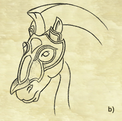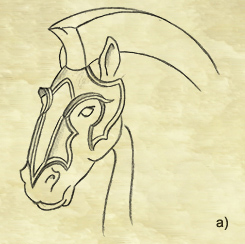 Sie schützt Stirn und Nasenrücken, zudem werden eine Wangenplatte und ein halber Ganaschenschutz angebracht. Dieser kann auf Wunsch offen bleiben (a) oder wird mit der restlichen Roßstirn unterhalb des Auges verbunden (b). Augenschilde sind hier stets mit dabei, Ohrenbecher und/ oder Nasenschutz, wie in Abbildung (b) zu sehen, können auf Wunsch beigefügt werden.  |