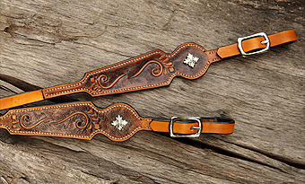.o offen Offene Zügel oder auch Split Reins für alle, die sich der Westernreiterei verschrieben haben oder einfach die Einsatzmöglichkeiten dieser Zügel bevorzugen. Die Gestaltungsmöglichkeiten sind die gleichen wie bei den geschlossenen Zügeln. Hier in unserem Beispielbild zu sehen: burgunderfarbene Zügel mit kleinen Fleur de Lis-Beschlägen und Prägungen an den Zügelenden.  |