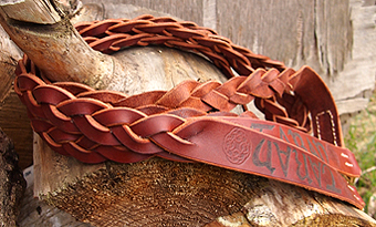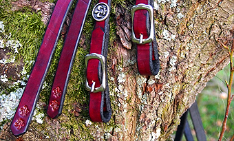 .o flach geflochten Zügel können auch - ohne lose Enden - flach geflochten werden. Die Flechtzügel sind immer aus speziell vorbehandeltem Leder, die Farbauswahl ist hier deswegen auf Brauntöne und Schwarz begrenzt. Die Zügel in unserem Beispiel wurden zusätzlich zur Flechtung noch mit einer Brandmalerei (Namenszug) und einer keltischen Prägung versehen.  |