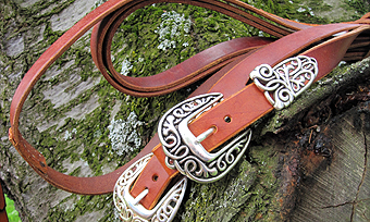 .o geschlossen Der allbekannte, durchgehende Zügel mit geschlossenen Enden. Auch hier kann individuell gestaltet werden: mit unterschiedlichen Farben und Farbeffekten, geprägten Mustern, kleinen Beschlägen und den unterschiedlichen Gebissbefestigungen. Das Beispiel zeigt schlicht gehaltene Zügel, die dafür mit auffälligen, schweren Schnallen und Riemenzungen versehen sind.  |